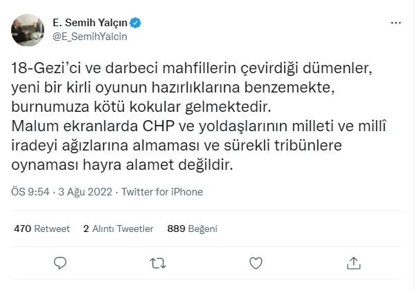 Gezi'ci ve darbeci mahfillerin çevirdiği dümenler, yeni bir kirli oyunun hazırlıklarına benzemekte, burnumuza kötü kokular gelmektedir. Malum ekranlarda CHP ve yoldaşlarının milleti ve millî iradeyi ağızlarına almaması ve sürekli tribünlere oynaması hayra alamet değildir.