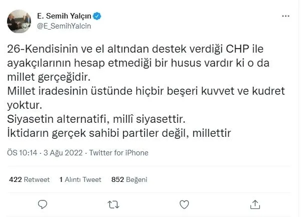 Kendisinin ve el altından destek verdiği CHP ile ayakçılarının hesap etmediği bir husus vardır ki o da millet gerçeğidir. Millet iradesinin üstünde hiçbir beşeri kuvvet ve kudret yoktur. Siyasetin alternatifi, millî siyasettir. İktidarın gerçek sahibi partiler değil, millettir.