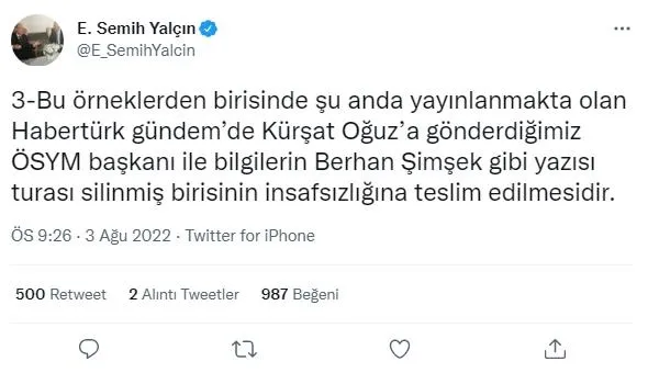 Bu örneklerden birisinde şu anda yayınlanmakta olan Habertürk Gündem'de Kürşat Oğuz'a gönderdiğimiz ÖSYM başkanı ile bilgilerin Berhan Şimşek gibi yazısı turası silinmiş birisinin insafsızlığına teslim edilmesidir.