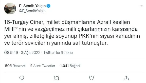 Turgay Ciner, millet düşmanlarına Azrail kesilen MHP'nin ve vazgeçilmez millî çıkarlarımızın karşısında yer almış, zilletçiliğe soyunup PKK'nın siyasi kanadının ve terör sevicilerin yanında saf tutmuştur.
