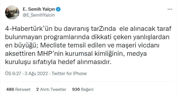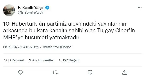 Habertürk'ün son dönemdeki yayınlarının Cumhur İttifakı'nı hedef aldığını söyleyen MHP Genel Başkan Yardımcısı, İstanbul Milletvekili Semih Yalçın, bu olayın Turgay Ciner'in MHP'ye olan husumetinden kaynaklandığını söyledi.