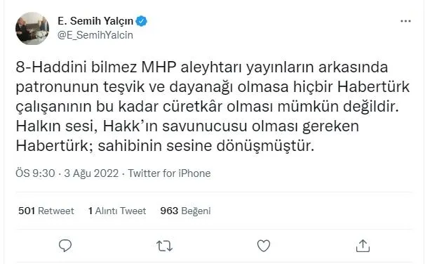 Haddini bilmez MHP aleyhtarı yayınların arkasında patronunun teşvik ve dayanağı olmasa hiçbir Habertürk çalışanının bu kadar cüretkâr olması mümkün değildir. Halkın sesi, Hakk'ın savunucusu olması gereken Habertürk; sahibinin sesine dönüşmüştür.