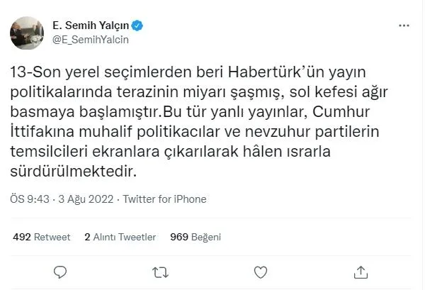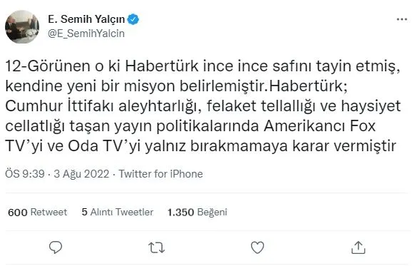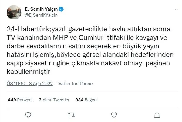 Yazılı basında havlu attıktan sonra televizyon yayınları üzerinden Cumhur İttifakı ile kavga etmenin yolunu seçen Habertürk'ün en büyük yayın hatasına imza attığını dile getiren Semih Yalçın, görsel alandaki hedeflerinden sapan söz konusu medya kuruluşunun siyaset ringinde nakavt olmayı peşinen kabul ettiğine dikkat çekti.