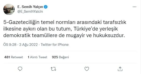 Gazeteciliğin temel normları arasındaki tarafsızlık ilkesine aykırı olan bu tutum, Türkiye'de yerleşik demokratik teamüllere de mugayir ve hukuksuzdur.