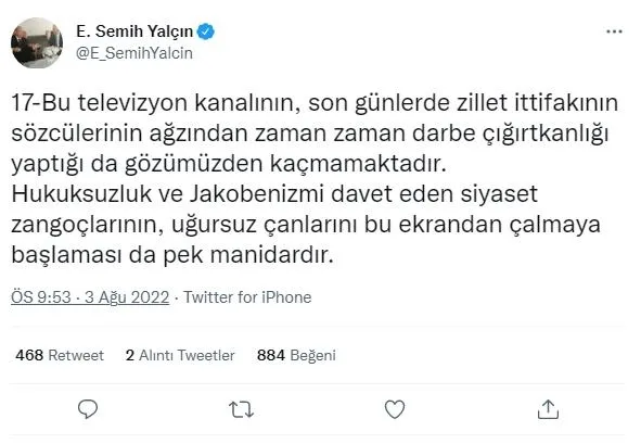 Bu televizyon kanalının, son günlerde zillet ittifakının sözcülerinin ağzından zaman zaman darbe çığırtkanlığı yaptığı da gözümüzden kaçmamaktadır. Hukuksuzluk ve Jakobenizmi davet eden siyaset zangoçlarının, uğursuz çanlarını bu ekrandan çalmaya başlaması da pek manidardır.