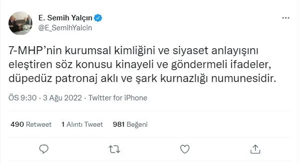 MHP'nin kurumsal kimliğini ve siyaset anlayışını eleştiren söz konusu kinayeli ve göndermeli ifadeler, düpedüz patronaj aklı ve şark kurnazlığı numunesidir.