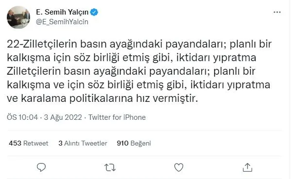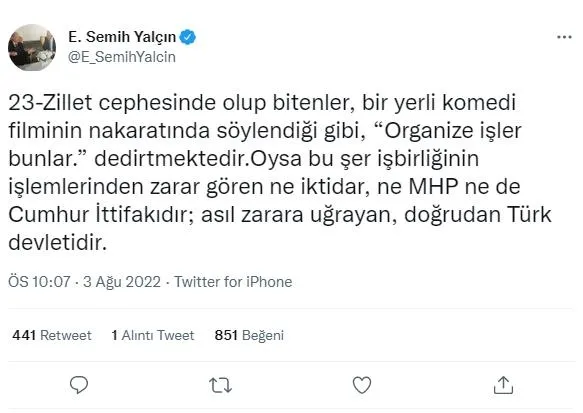 Ciner Medya'nın 2023 seçimlerine sayılı bir zaman kala Zillet İttifakı'nın basın ayağındaki payandası haline geldiğini ifade eden MHP Genel Başkan Yardımcısı Semih Yalçın, bu durumu 'Organize İşler' ifadesiyle yorumladı ve söz konusu şer birliğinden asıl zarar görenin doğrudan Türk devleti olduğunu söyledi.