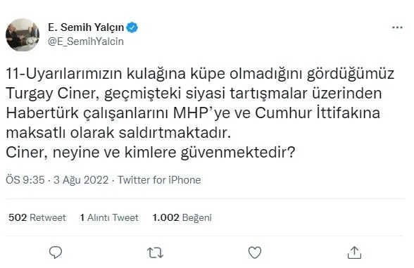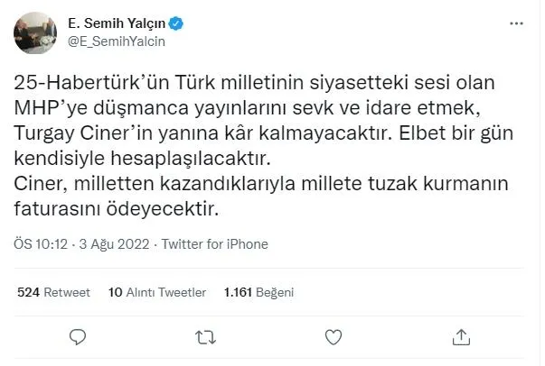 Ciner'in geçmişteki siyasi tartışmalar üzerinden Habertürk çalışanlarını MHP'ye ve Cumhur İttifakına maksatlı olarak saldırttığını söyleyen MHP Genel Başkan Yardımcısı, "Ciner, neyine ve kimlere güvenmektedir?" sorusunu sordu.