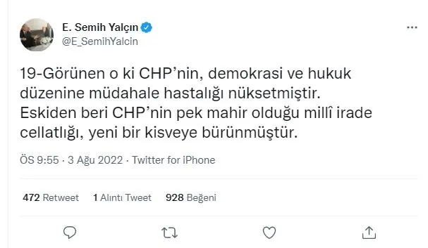 "CHP'NİN DEMOKRASİ DÜZENİNE MÜDAHALE ETME HASTALIĞI NÜKSETTİ"