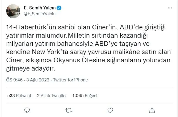 Yalçın bu durumu "Milletin sırtından kazandığı milyarları yatırım bahanesiyle ABD'ye taşıyan ve kendine New York'ta saray yavrusu malikâne satın alan Ciner, sıkışınca Okyanus Ötesine sığınanların yolundan gitmeye adaydır" sözleriyle yorumladı.