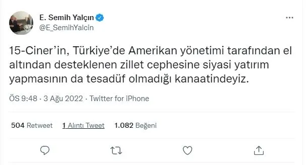 Ciner'in, Türkiye'de Amerikan yönetimi tarafından el altından desteklenen zillet cephesine siyasi yatırım yapmasının da tesadüf olmadığını ifade eden Yalçın, "Turgay Ciner, millet düşmanlarına Azrail kesilen MHP'nin ve vazgeçilmez millî çıkarlarımızın karşısında yer almış, zilletçiliğe soyunup PKK'nın siyasi kanadının ve terör sevicilerin yanında saf tutmuştur" şeklinde konuştu.