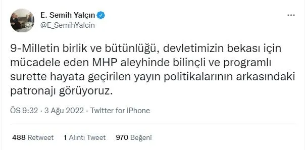 Milletin birlik ve bütünlüğü, devletimizin bekası için mücadele eden MHP aleyhinde bilinçli ve programlı surette hayata geçirilen yayın politikalarının arkasındaki patronajı görüyoruz.