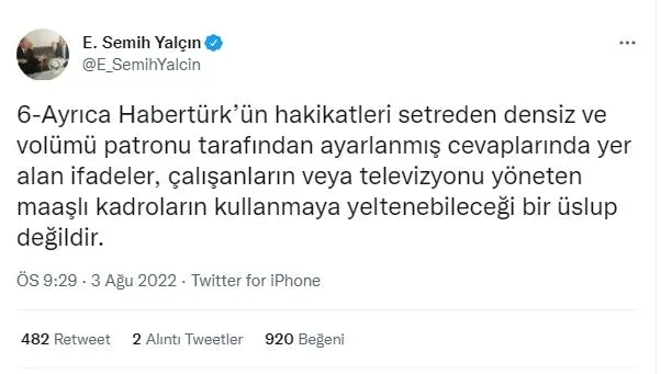 Ayrıca Habertürk'ün hakikatleri setreden densiz ve volümü patronu tarafından ayarlanmış cevaplarında yer alan ifadeler, çalışanların veya televizyonu yöneten maaşlı kadroların kullanmaya yeltenebileceği bir üslup değildir.