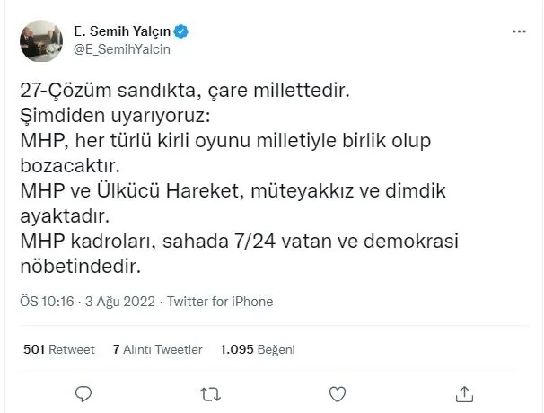 Çözüm sandıkta, çare millettedir. Şimdiden uyarıyoruz: MHP, her türlü kirli oyunu milletiyle birlik olup bozacaktır. MHP ve Ülkücü Hareket, müteyakkız ve dimdik ayaktadır. MHP kadroları, sahada 7/24 vatan ve demokrasi nöbetindedir.