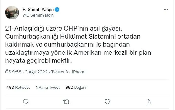 Anlaşıldığı üzere CHP'nin asıl gayesi, Cumhurbaşkanlığı Hükümet Sistemini ortadan kaldırmak ve cumhurbaşkanını iş başından uzaklaştırmaya yönelik Amerikan merkezli bir planı hayata geçirebilmektir.