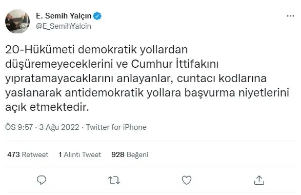 Hükümeti demokratik yollardan düşüremeyeceklerini ve Cumhur İttifakını yıpratamayacaklarını anlayanlar, cuntacı kodlarına yaslanarak antidemokratik yollara başvurma niyetlerini açık etmektedir.