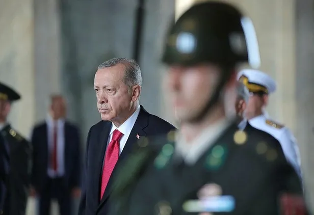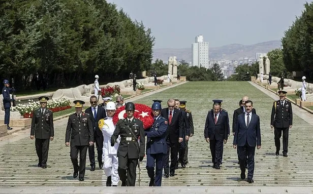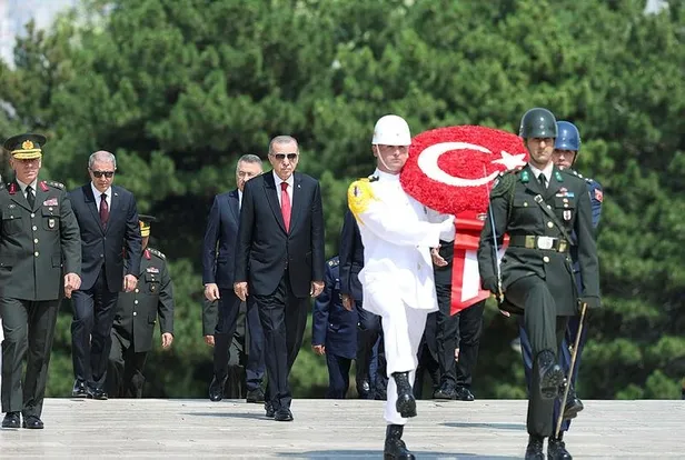 Başkan Erdoğan'ın ay yıldız motifli çelengi Atatürk'ün mozolesine bırakmasının ardından saygı duruşunda bulunuldu, İstiklal Marşı okundu.