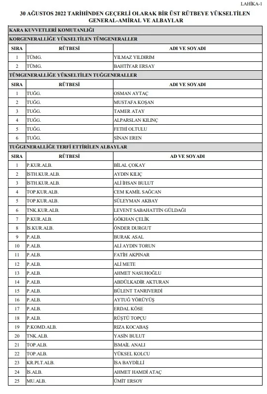 38 general ve amiral emekliliğe sevk edildi. Yüksek Askeri Şura'da, 30 Ağustos 2022'den geçerli olmak üzere 16 general ve amiral bir üst rütbeye, 47 albay ise general ve amiralliğe yükseltildi.