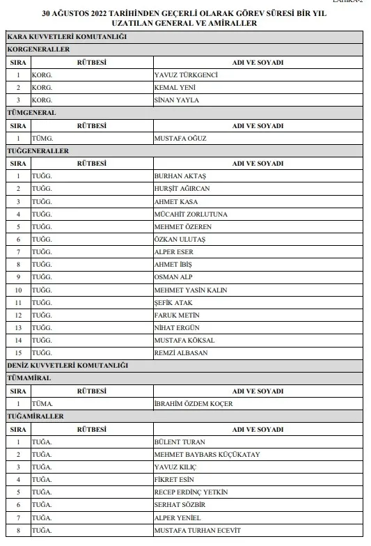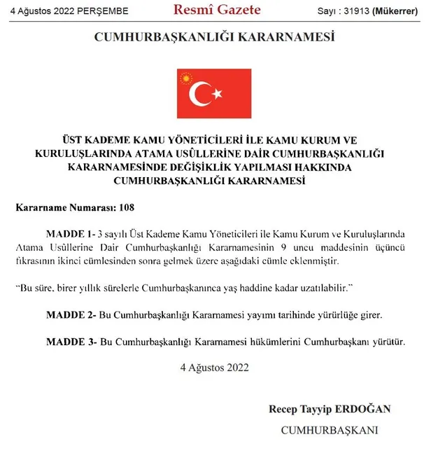 Buna göre, Üst Kademe Kamu Yöneticileri ile Kamu Kurum ve Kuruluşlarında Atama Usullerine Dair Cumhurbaşkanlığı Kararnamesinin "Subaylığa nasıp, terfi ve atama" başlıklı 9. maddesinin "Genelkurmay Başkanı, orgeneral-oramiraller arasından atanır. Genelkurmay Başkanının görev süresi 4 yıldır. Görevdeki kalış süresinin tespitinde, atanmış bulunduğu yılın 30 Ağustos tarihi esas alınır" fıkrasına "Bu süre, birer yıllık sürelerle Cumhurbaşkanınca yaş haddine kadar uzatılabilir." cümlesi eklendi.
