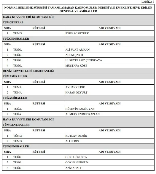 Deniz Kuvvetleri Komutanı Oramiral Adnan Özbal ile Hava Kuvvetleri Komutanı Orgeneral Hasan Küçükakyüz kadrosuzluk nedeniyle emekliye sevk edildi.