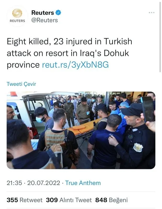 İngiliz haber ajansı Reuters; bu haberi, "Türkiye'nin Irak'ın Dohuk ilindeki tatil köyüne düzenlediği saldırıda 8 kişi öldü, 23 kişi yaralandı" şeklinde servis ederken ABD merkezli Amerika'nın Sesi VOA (Voice of America) Türkçe de, "Türkiye'nin Irak'taki hava saldırısında turistler öldü" dedi.