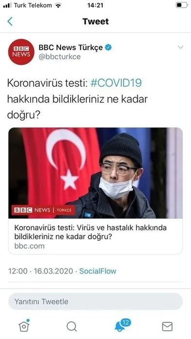 İngiliz yayın organı BBC'nin Türkçe yayın yapan sitesi; koronavirüs hakkındaki haberinde Türk bayrağı önünde bir Asyalı fotoğrafı kullandı.