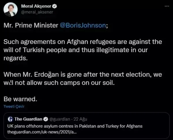 22 Ağustos 2021 saat :22.55- Meral Akşener, İngilizce bir paylaşım daha yaparak İngiltere Başbakanı Boris Johnson'u etiketledi ve "Sayın Başbakan Boris Johnson. Afgan mültecilerle ilgili bu tür anlaşmalar Türk halkının iradesine aykırıdır ve bu nedenle bizim açımızdan gayri meşrudur. Bir sonraki seçimden sonra Sayın Erdoğan gittiğinde topraklarımızda bu tür kamplara izin vermeyeceğiz. Dikkatli olun" iddiasında bulundu.