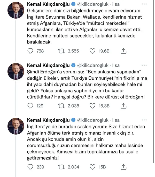 22 Ağustos 2021 saat: 23.39-CHP Genel Başkanı Kemal Kılıçdaroğlu, "Millet İttifakı karşı çıkmasa ülke çıkarlarını korumak aklınızdan dahi geçmiyor. Biz sesimizi çıkarıyoruz, yarım saat sonra siz uyanıyorsunuz. Antetli A4 Bakanlığı'na dönüştünüz. Yüzlerce yıllık hariciye geleneğimize yazık" iddiasında bulundu.