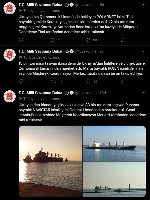 Paylaşımda, "24 Şubat'tan beri Ukrayna limanlarından çıkamayan Türk bayraklı POLARNET ile Türk sahipli NAVİSTAR gemilerimiz limanlardan ayrılarak ülkemize doğru seyre başladı. Tahıl koridoru ile açılan Ukrayna limanlarında bulunan diğer 6 gemimiz de en yakın zamanda ayrılacaklar." ifadesi kullanıldı.