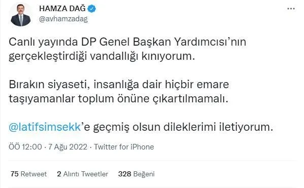 AK Parti Genel Başkan Yardımcısı Hamza Dağ da sosyal medya hesabı Twitter üzerinden yaptığı paylaşımla Latif Şimşek'e yönelik gerçekleştirilen saldırıyı kınadı. Dağ paylaşımında "Canlı yayında DP Genel Başkan Yardımcısı'nın gerçekleştirdiği vandallığı kınıyorum. Bırakın siyaseti, insanlığa dair hiçbir emare taşıyamanlar toplum önüne çıkartılmamalı. Latif Şimşek'e geçmiş olsun dileklerimi iletiyorum" ifadelerine yer verdi.