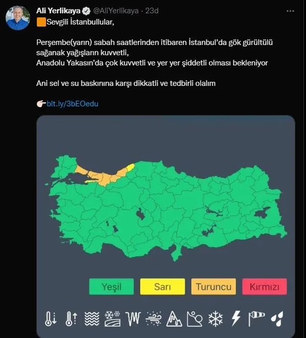 Yerlikaya, paylaşımında İstanbul Valiliğinin internet sitesinde yer alan "Marmara'nın doğusunda kuvvetli gök gürültülü sağanak yağışlara dikkat" şeklindeki duyuruya da link verdi.
