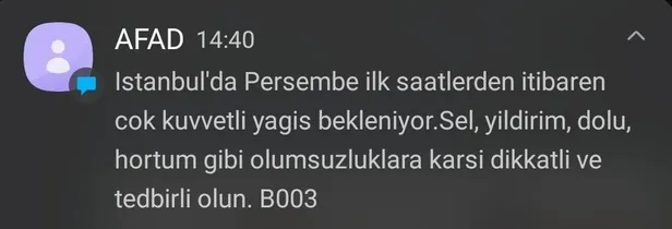 İstanbul'daki kuvvetli yağışla ilgili AFAD'dan telefonlara uyarı gönderildi. AFAD'dan gelen mesajda, "İstanbul'da Perşembe ilk saatlerden itibaren çok kuvvetli yağış bekleniyor. Sel, yıldırım, dolu, hortum gibi olumsuzluklara karşı dikkatli ve tedbirli olun." ifadelerine yer verildi.