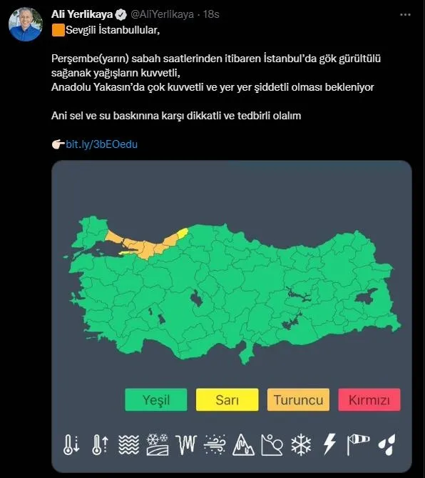 Meteoroloji Danışmanı Prof. Dr. Orhan Şen, "Sabah 09:00-10:00 civarında Anadolu Yakası'nda şiddetli yağmur 14:00'e kadar sürer. Saatte 10 kilogram üzerinde yağmur yağar. Şehir içinde su baskınları, Şile-Ağva civarında dere taşkınları olur" mesajını paylaştı. Prof. Dr. Şen, "Yağışlar öğleden önce İstanbul'un Anadolu Yakası'nın doğusunda ve özellikle Şile-Ağva-Kefken arasında şiddetli olacağı görülüyor. Öğlen ve sonrası şiddetli kısım doğuya kayacak ve Kocaeli, Sakarya, Düzce ve Zonguldak'ta etkili olacak. Akşam bölgeyi terk edecek" dedi.