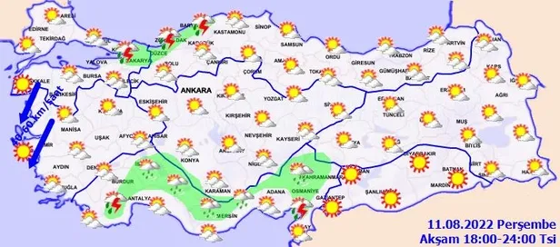 Parçalı, iç ve güney kesimlerin yer yer çok bulutlu, Muğla çevreleri ile Denizli'nin güney ve doğu, Afyonkarahisar'ın güneybatı ilçelerinin yerel sağanak ve gök gürültülü sağanak yağışlı geçeceği tahmin ediliyor. Yağışların; öğle saatlerinden sonra Muğla'nın iç kesimleri ile Denizli'nin güney ve doğu, Afyonkarahisar'ın güneybatı ilçelerinde yerel kuvvetli olması bekleniyor. Rüzgârın, Kuzey Ege kıyılarında kuzey ve kuzeydoğu yönlerden yer yer kuvvetli (40-70 km/sa) esmesi bekleniyor.