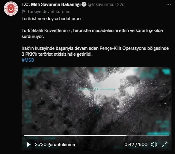 Bakanlığın sosyal medya hesabından yapılan paylaşımda, "Terörist neredeyse hedef orası. Türk Silahlı Kuvvetlerimiz, teröristle mücadelesini etkin ve kararlı şekilde sürdürüyor. Irak'ın kuzeyinde başarıyla devam eden Pençe-Kilit Operasyonu bölgesinde 3 PKK'lı terörist etkisiz hale getirildi." ifadelerine yer verildi.