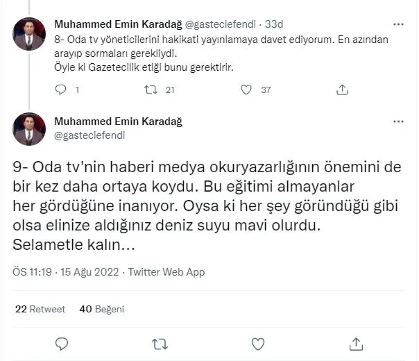 8- Oda tv yöneticilerini hakikati yayınlamaya davet ediyorum. En azından arayıp sormaları gerekliydi. Öyle ki gazetecilik etiği bunu gerektirir.