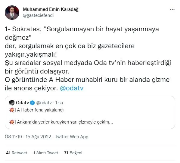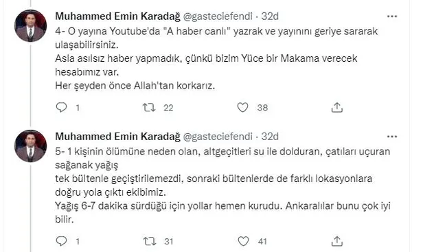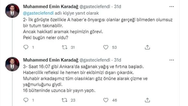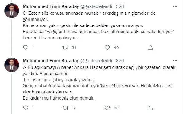 7- Bu açıklamayı A Haber Ankara Haber Şefi olarak değil, bir gazeteci olarak yazdım. Vicdan sahibi bir insan bir ağabey olarak yazdım. Genç muhabir arkadaşımızın daha yürüyeceği çok yol var. Hepimizin ailesi, akrabası arkadaşları var. Bu kadar merhametsiz olunmamalı.