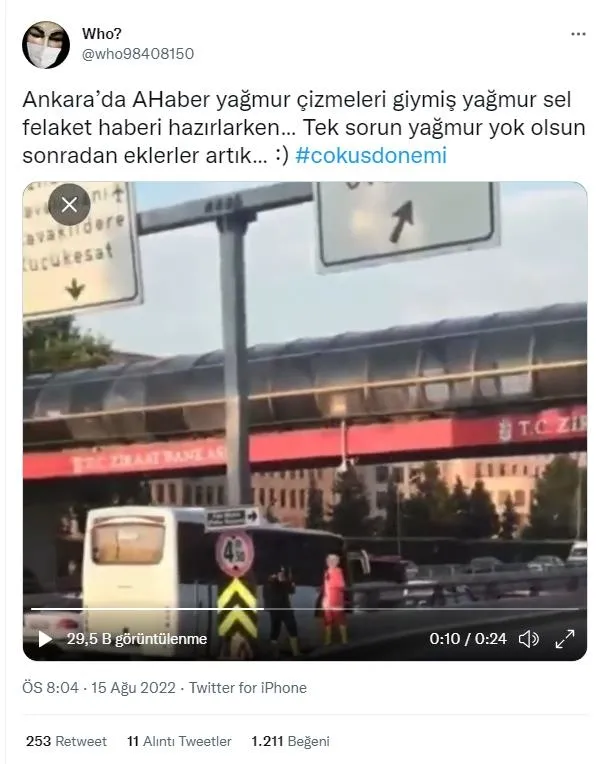 Twitter üzerinden paylaşımda bulunan bir başka sosyal medya kullancısı ise, "Bugün Ankara'da 1 kişinin ölümüyle sonuçlanan bir fırtına meydana geldi. Yarım saat sonra düzeldi hava. Şiddetli yağış sonrası dışarıya çıkarken ben de çizmemi giydim. O yüzden bu görüntü hiç de anormal değil. Bugün Ankara'daki hiç kimse için bu görüntünün bir haber değeri yok"