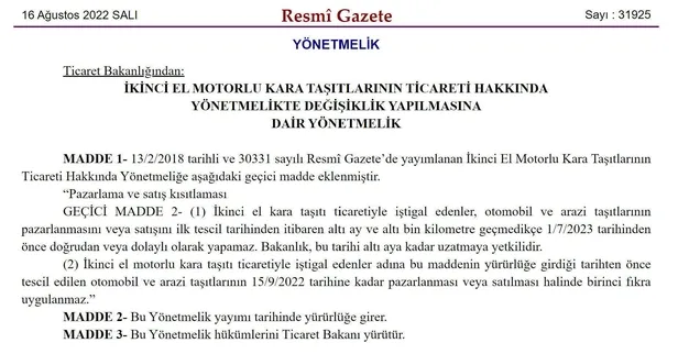 Bakanlıktan yapılan açıklamaya göre, ikinci el motorlu kara taşıtı ticareti ile iştigal edenlerin halihazırda kendi adlarına tescilli taşıtların 15 Eylül 2022 tarihine kadar satılabilmesine imkan sağlanacak. Söz konusu taşıtların satışının 15 Eylül 2022 tarihine kadar gerçekleşmemesi halinde, bu taşıtların pazarlaması ve satışı da ilk tescil tarihinden itibaren altı ay ve altı bin kilometre geçmediği sürece yapılamayacak.