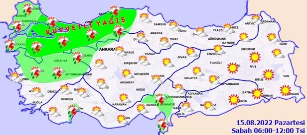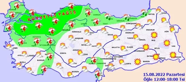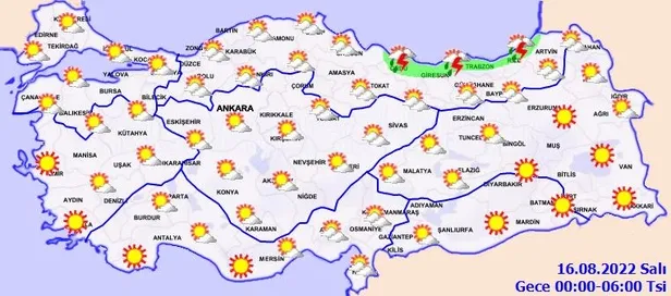 Meteoroloji Genel Müdürlüğü tarafından yapılan son değerlendirmelere göre; Yurdun kuzey, iç ve batı kesimlerinin parçalı ve yer yer çok bulutlu, Marmara, Kuzey Ege, İç Anadolu'nun kuzeybatısı, Batı ve Orta Karadeniz, Doğu Karadeniz kıyıları ile Antalya, Isparta, Adana'nın kuzeyi, Osmaniye, Kahramanmaraş'ın batısı ve Hatay kıyılarının yerel olmak üzere sağanak ve gök gürültülü sağanak yağışlı, diğer yerlerin az bulutlu ve açık geçeceği tahmin ediliyor. Yağışların; Marmara'nın doğusu, Batı Karadeniz(Sinop hariç), Çanakkale'nin iç kesimleri, Eskişehir çevreleri ile Ankara ve Çankırı'nın kuzey ve batı kesimlerinde yer yer kuvvetli olması bekleniyor.