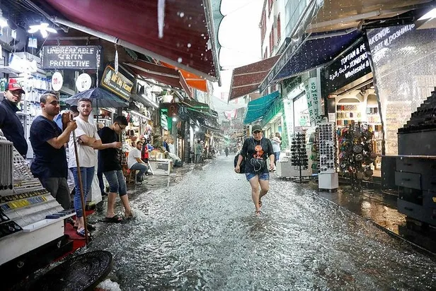 Eminönü bölgesinde rögar kapaklarından taşan yağmur suyu nedeniyle araçlar ilerlemekte güçlük yaşadı. Vatandaşlar ve turistler ıslanmamak için kapalı yerlerde bekledi.