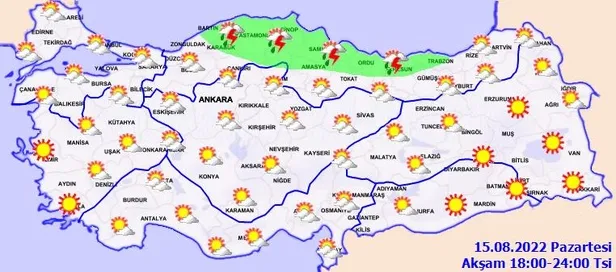 Parçalı ve yer yer çok bulutlu, öğle saatlerinden sonra Orta Karadeniz ile Doğu Karadeniz kıyılarının yerel olmak üzere sağanak ve gök gürültülü sağanak yağışlı geçeceği tahmin ediliyor.