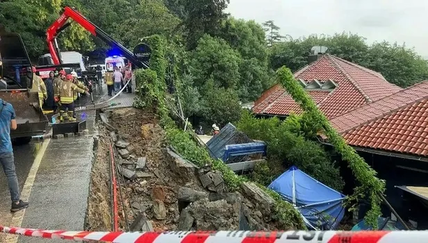 Beykoz'da yağışın ardından istinat duvarı çöktü.
