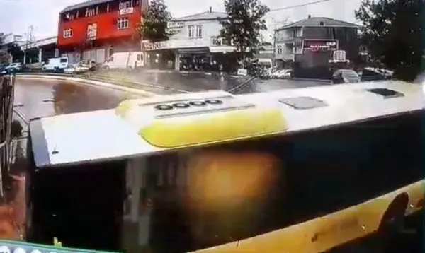 Korku dolu kazada İETT otobüsünün devrilmemesi muhtemel bir faciayı önlerken, yüreklerin ağza geldiği kaza anı güvenlik kamerasına saniye saniye yansıdı.