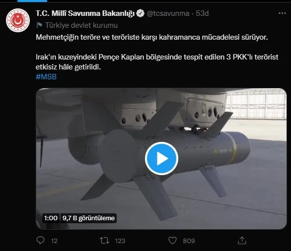 Bakanlıktan yapılan açıklamada, Mehmetçiğin teröre ve teröriste karşı kahramanca mücadelesinin sürdüğü belirtilerek, "Irak'ın kuzeyindeki Pençe Kaplan bölgesinde tespit edilen 3 PKK'lı terörist etkisiz hale getirildi." ifadesine yer verildi.