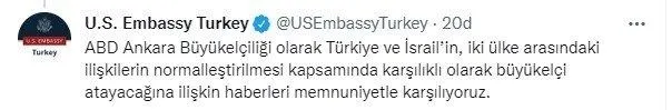 Büyükelçiliğin Twitter'daki hesabından yapılan açıklamada, "ABD Ankara Büyükelçiliği olarak Türkiye ve İsrail'in, iki ülke arasındaki ilişkilerin normalleştirilmesi kapsamında karşılıklı olarak büyükelçi atayacağına ilişkin haberleri memnuniyetle karşılıyoruz" denildi.