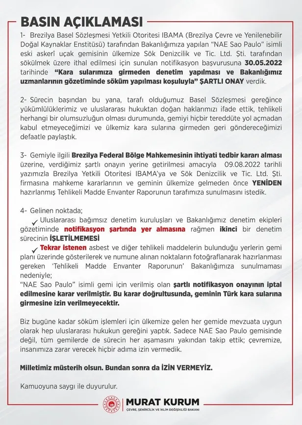 Kurum, "Uluslararası bağımsız denetim kuruluşları ve Bakanlığımız denetim ekipleri gözetiminde notifikasyon şartında yer almasına rağmen ikinci bir denetim sürecinin işletilmemesi; tekrar istenen asbest ve diğer tehlikeli maddelerin bulunduğu yerlerin gemi planı üzerinde gösterilerek ve numune alınan noktaların fotoğraflanarak hazırlanması gereken 'Tehlikeli Madde Envanter Raporunun' Bakanlığımıza sunulmaması nedeniyle; 'NAE Sao Paulo' isimli gemi için verilmiş olan şartlı notifikasyon onayının iptal edilmesine karar verilmiştir. Bu karar doğrultusunda; geminin Türk karasularına girmesine izin verilmeyecektir" dedi.