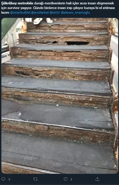İstanbul Avcılar'da bulunan Şükrübey Metrobüs Durağı adeta kaderine terk edildi. Her gün on binlerce kişinin kullandığı duraktaki üst geçit çürüdü. Vatandaşlar çürüyen durağın görüntüsünü sosyal medyada paylaşarak İBB'ye tepki gösterdi. Çürüyen, her tarafı paslanan üst geçitten geçmeye korktuğunu ifade eden vatandaşlar, üst geçidin bakımsızlık nedeniyle çökme riskiyle karşı karşıya olduğunu belirtti.