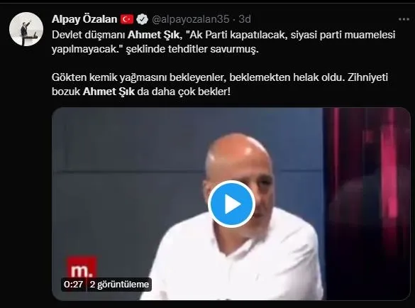 Bir başka vatandaş ise, "Şehit Savcı Mehmet Selim Kiraz'ın katilli DHKP-C'li teröristlerin pr'ni yapan Ahmet Şık "AKP bir siyasi parti değil bir suç örgütü ve kapatılacak" demiş. Allah bunlara fırsat vermesin…" dedi.