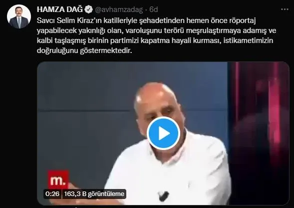 Savcı Selim Kiraz'ın katillerinin PR'ını yapan Şık'a tepki gösteren AK Parti İzmir Milletvekili Hamza Dağ, "Savcı Selim Kiraz'ın katilleriyle şehadetinden hemen önce röportaj yapabilecek yakınlığı olan, varoluşunu terörü meşrulaştırmaya adamış ve kalbi taşlaşmış birinin partimizi kapatma hayali kurması, istikametimizin doğruluğunu göstermektedir." dedi.